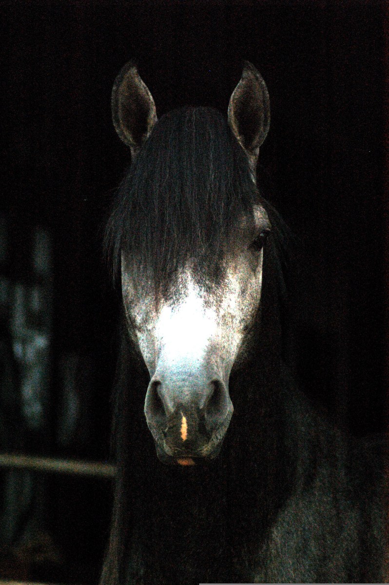 Dramatic portrait of a grey purebred Arabian colt with black forelock and expressive eyes, looking directly into the camera out of a dark shadowed doorway, showing classic tipped ears and a snip on the nose.