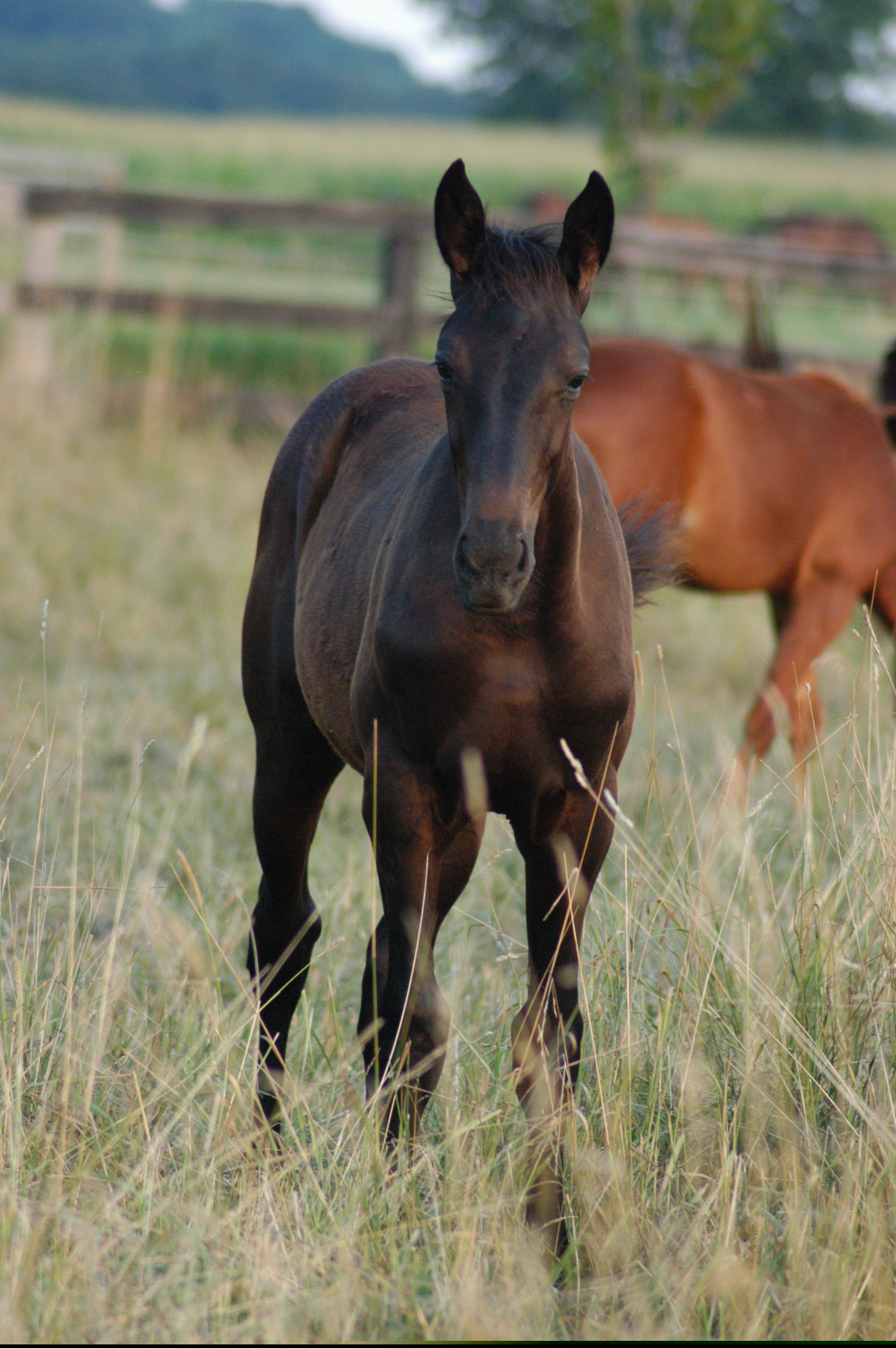 Lovely independent and curious dark bay standardbred filly foal, approaching the camera with an alert, but friendly expression, amongst the long grass of late summer pasture.